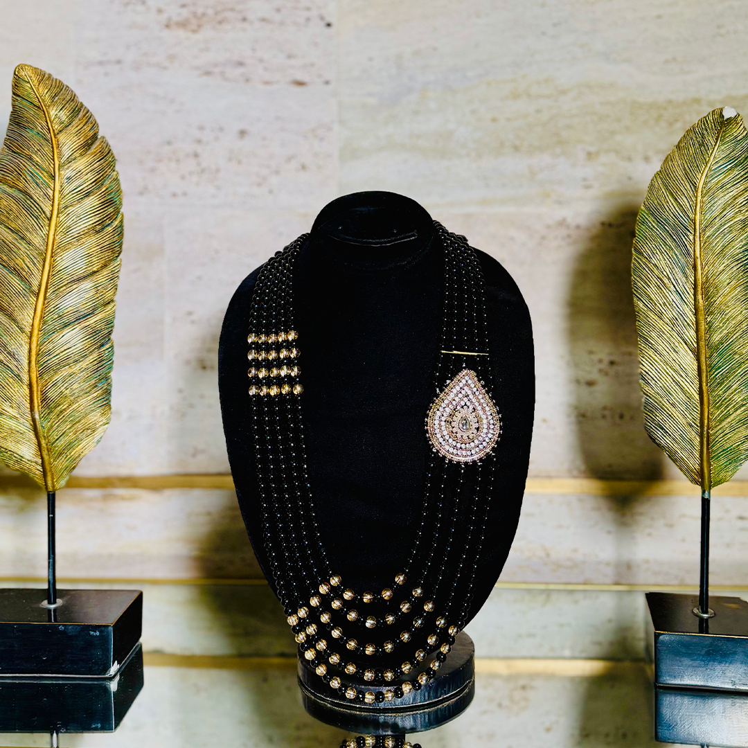 A Multi-Layered Black & White Pearls Moti Mala adorning a Gold Tone Droplet Mughal Floral...
