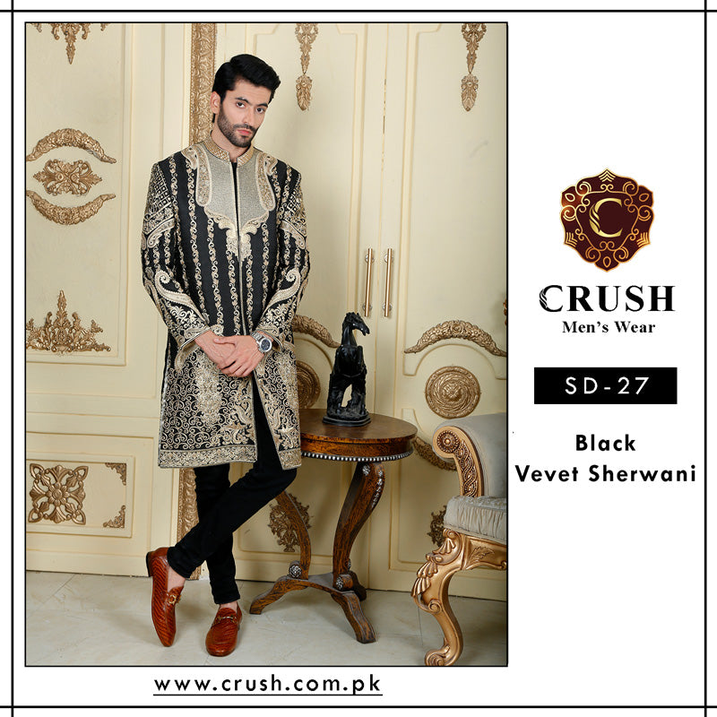 This Pure Black Black Velvet Sherwani with Detailed Hand-worked Motif is the perfect choice for...