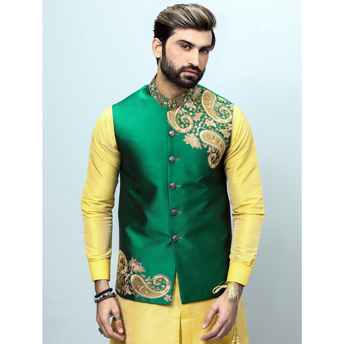 Raw Silk Embroidery Design Waistcoat For Mehndi
