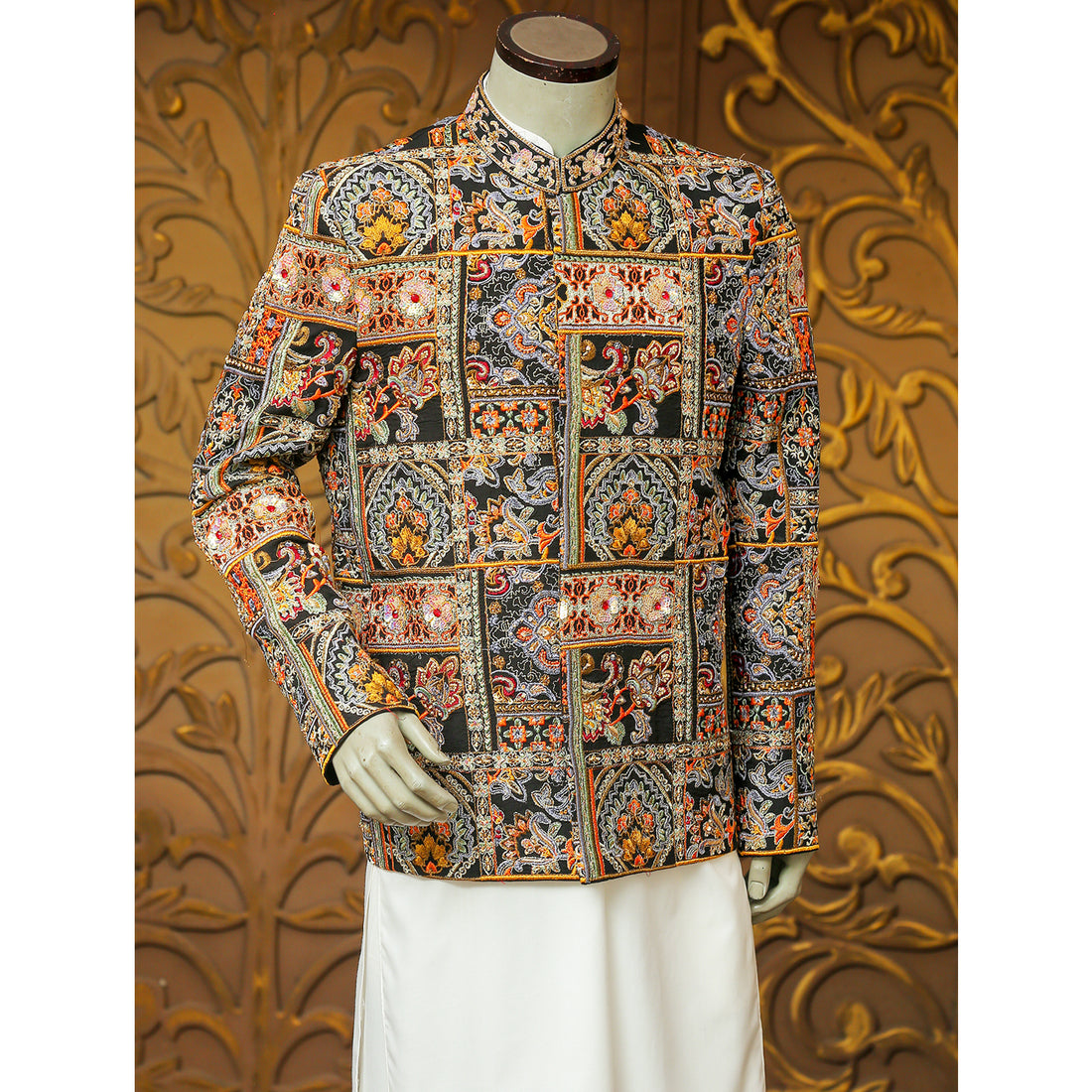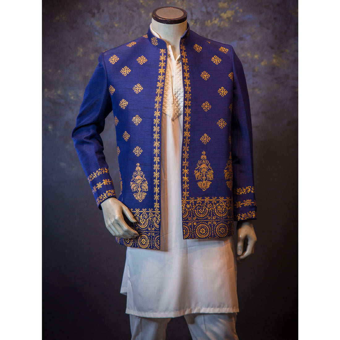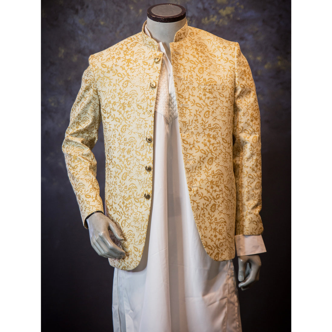 Block Printed Raw Silk Prince Coat w/ Detailed Handwork