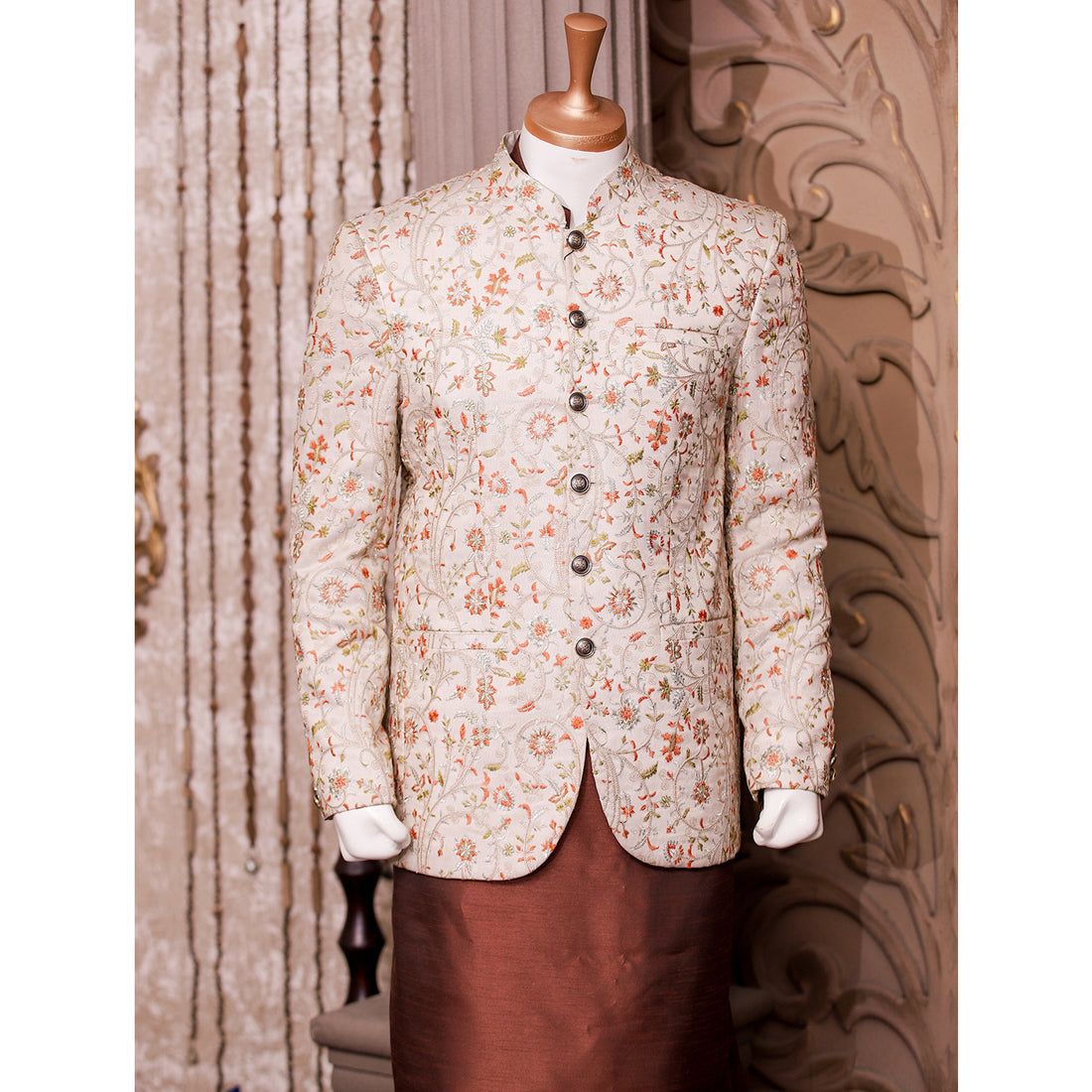 This Block Printed Raw Silk Prince Coat makes your traditional look complete this wedding season...