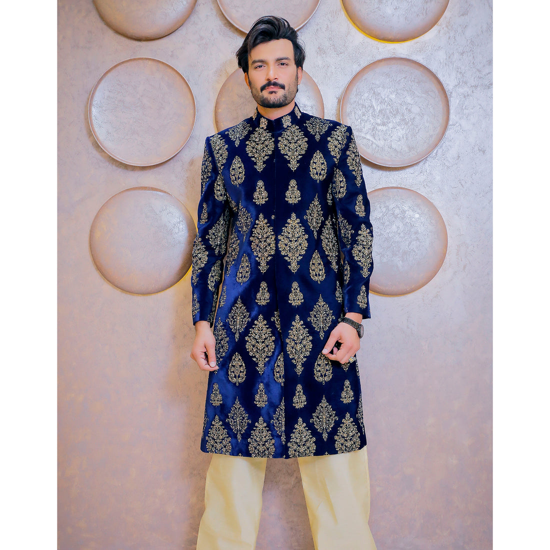 Exude tradition with our exquisite sherwani, featuring a luxurious royal blue velvet base adorned with...