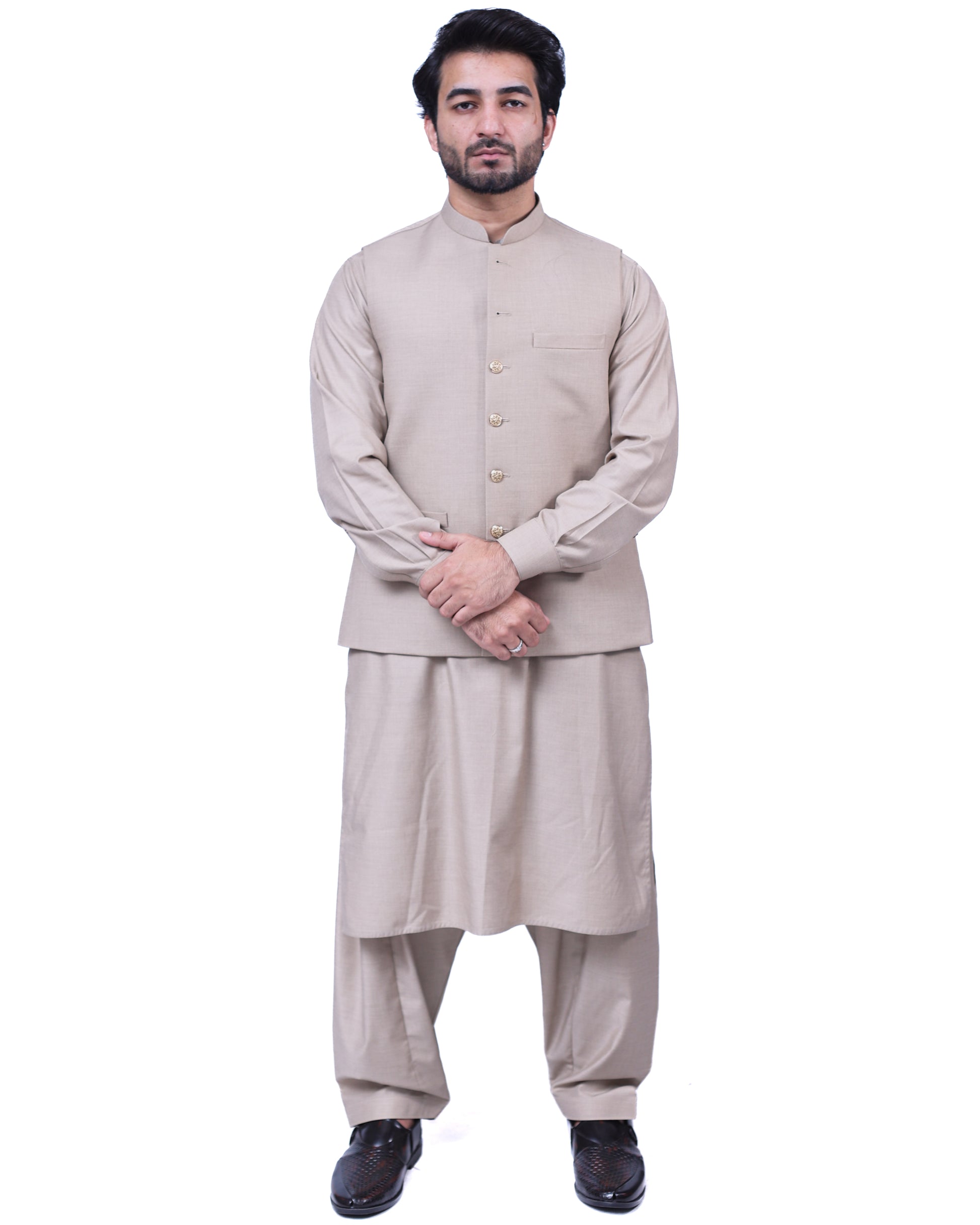 Men’s Matching Shalwar Kameez with Waistcoat – Crush Menswear light beige